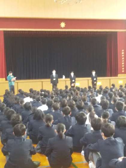 また、「大阪市教師養成講座」で学ばれている3名の先生が3日間、本校で現場実習をされます。その方々の紹介がありました。更に、「税の作文」で2名の生徒のみなさんが表彰されました。おめでとうございます。