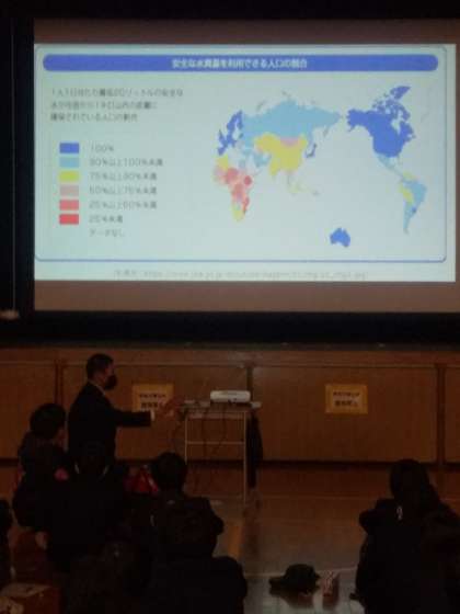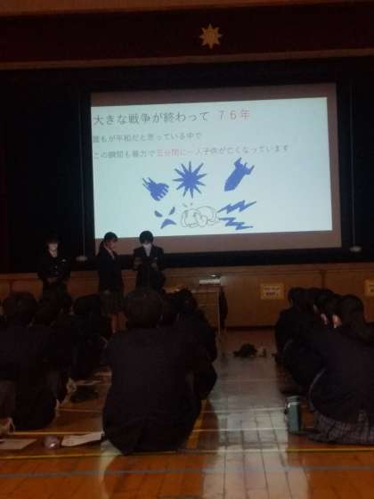 2年生は6限目に体育館で「SDGs学年発表会」を行いました。各学級代表の2班、計8班がそれぞれの項目についてパワーポイントを使いながら、アピールしました。今まで頑張って準備をしてきただけあって、いずれも聞きごたえがあり、考えさせるものばかりでした。司会進行も学級代表の生徒のみなさんで行いました。体育館中に「学び」があふれた1時間でした。