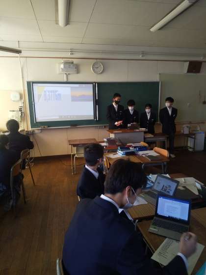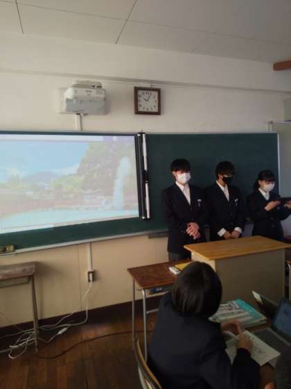 2年生では英語の授業の中で、TIM先生への観光案内を実施しました。各クラス8班の発表です。先日のSDGs同様、全てのグループがパワーポイントをうまく使って、英語でプレゼンを出来ました。聞いているだけで思わず行きたくなるようなワクワクするものばかりでした。