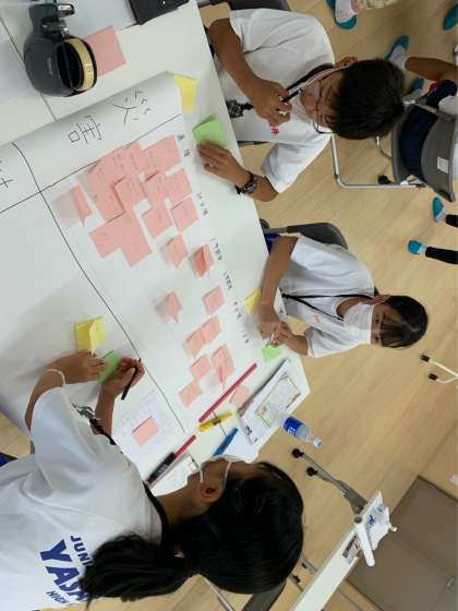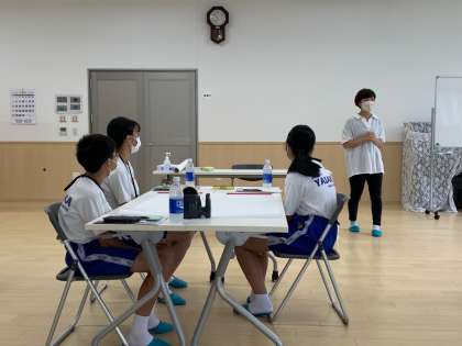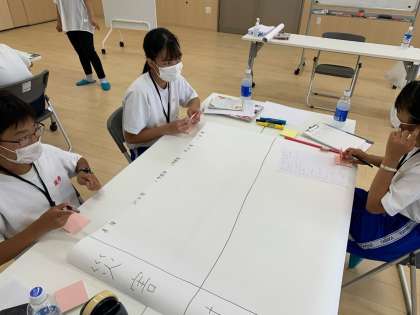 実際に地震が起きたと想定してどんな災害が起きるかどう対応するか、何を備えておくかを生徒自身で考えていきました。