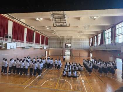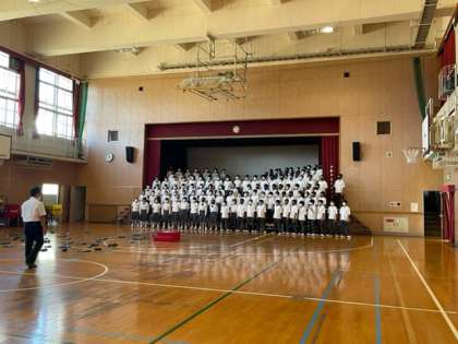 初めての体育館での練習で学級代表が指示を出し合唱の隊形に整列をしました。