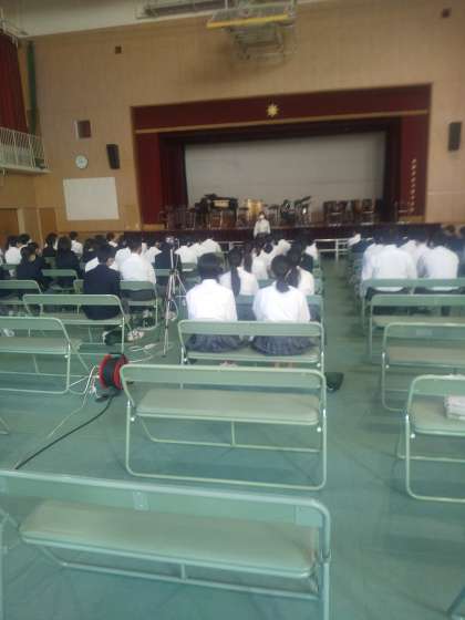 本日、プレゼン八阪、舞台発表の部です。状況により、体育館での鑑賞、教室でリモート鑑賞。保護者の方は所定の時間に動画配信にての鑑賞となります。開会式です。