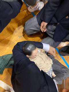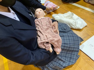 後半では赤ちゃん抱っこ体験と妊婦体験でした。妊婦体験でさまざまな動作をしたみなさんからは、