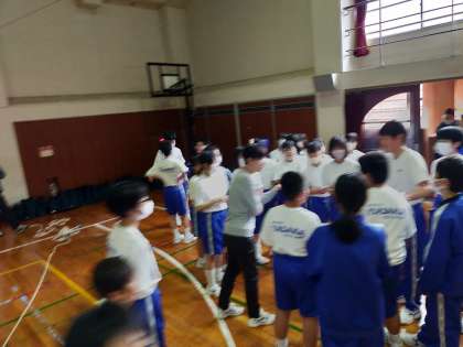 クラス対抗長縄大会、次の男女混合での跳躍に向けて、各クラスでミーティングです。