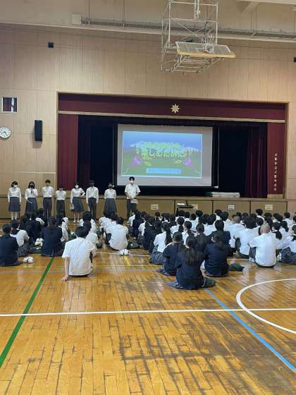 今回はまず鈴木先生から『行動力』について話がありました。次に保健委員が『修学旅行を楽しむために』の発表があり、注意事項など再確認しました。最後に石塚先生からルールを守るためにと言うお話しがありました。