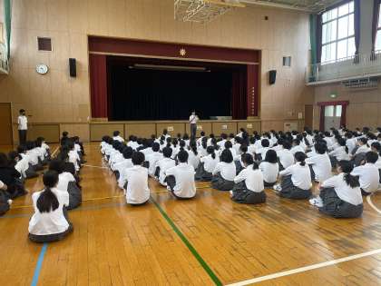 1年生の学年集会がありました。まず、学級代表から6月の目標が発表されました。6月の目標は「わすれものゼロ」です。各学級で忘れ物が多く見られるため学級代表で考えました。