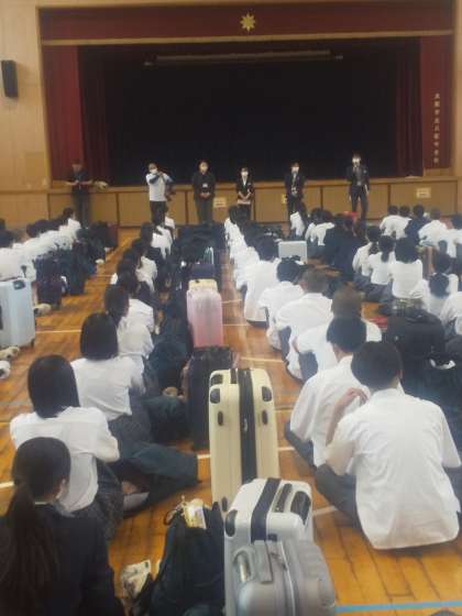 出発式 添乗員さん、写真屋さん、看護師さんです。3日間、よろしくお願いします。