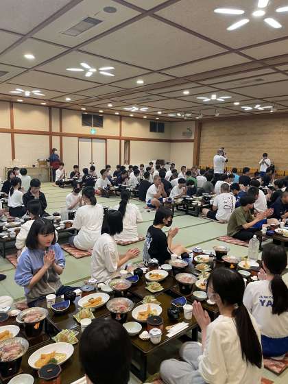 夕食です!みんなラフティングの疲れを吹っ飛ばすように、たくさん食べています!