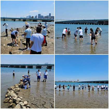 今年度はじめの海遊館連携学習会を行いました。今回は淀川河川敷にある海老江干潟にて以前から活動を続けている石干見(いしひび)漁体験を行いました。