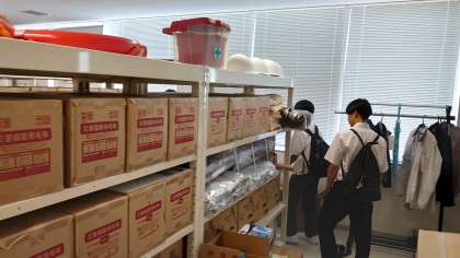 備蓄倉庫の中を案内していただきました。アルファ化米、2リットルの飲料水、毛布など、想定避難者数の1386人分の災害備蓄品が保管されていました。