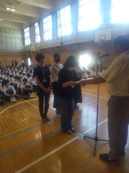 PTAの方々の表彰式がありました。PTAバレーボール大会で見事、準優勝されました。おめでとうございます。