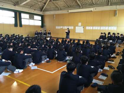 現代の社会問題について調べた内容を8名の生徒が2年生全員の前で発表してくれました。緊張している様子も見られましたが、各クラスで選ばれた生徒たちです。しっかりと研究し、緻密に作り上げられた文章であることが本当によく伝わってきました。代表者の皆さん、お疲れさまでした!