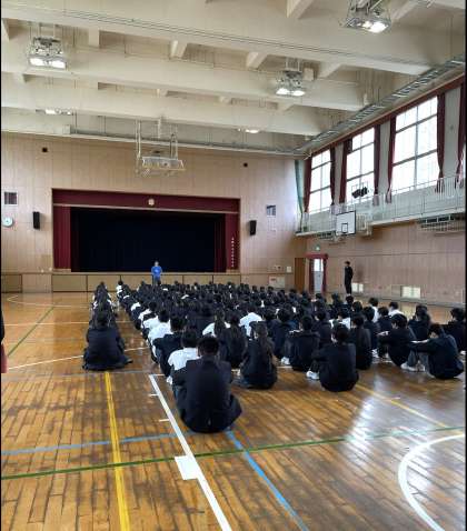 今日は1年生で、初めての学年集会がありました。みんな時間通りしっかり集合することができました。集会では、鈴木先生からお話がありました。『言葉遣い』や『挨拶について』や『時間の管理』のお話がありました。そのあとは1時間目スタートです。