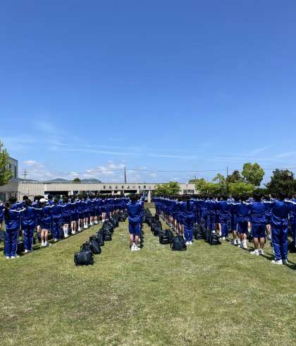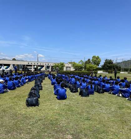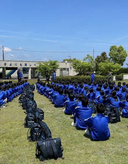 青空の下、八阪中学校の青色ジャージの色が映える中で、退所式が行われました!マリーンピアの方に感謝の気持ちを伝えて、2日間で成長した思い出を胸に、八阪中学校へ向かいます!