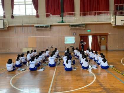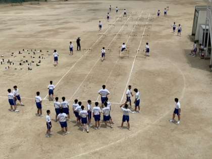 2年生保健体育の授業は、男子グラウンドでハードル走、女子は体育館で教育実習生が倒立前転のやり方を説明しています。