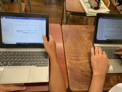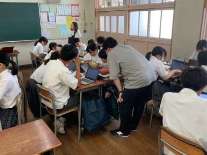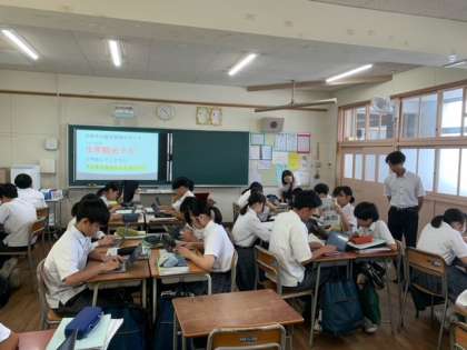 2年生社会の授業ですが中国・四国地方の内容です。広島・岡山の芸備線を存続するべきか、廃止にするべきか、意見を出し合っています。