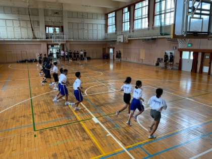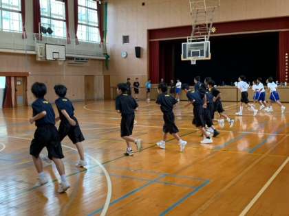 陸上部の中長距離パートと男子バスケットボール部は合同でシャトルランをやっています。お互い負けられません。