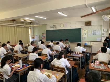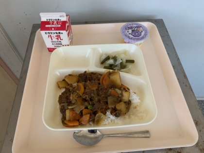 久し振りの給食です。人気メニュー、カレーライスにおかわり続出です。美味しくいただきました。
