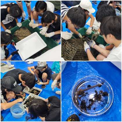 実際にカゴを引き上げてみると、やはりヘドロが多く生き物の種類は少ない印象でした。しかし、そんな劣悪な環境下でもたくましく生きる生物もたくさんおり、生徒たちはヘドロをかき分けながらたくさんの生き物を探し出してくれました。また、メバルの仲間もカゴに入っており、大阪湾の環境は良くなっているなと実感しました。