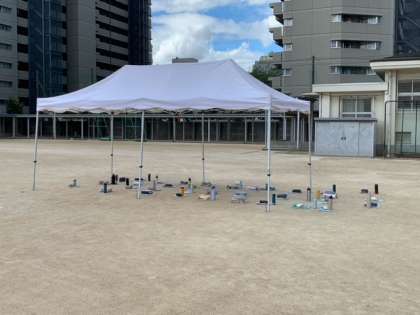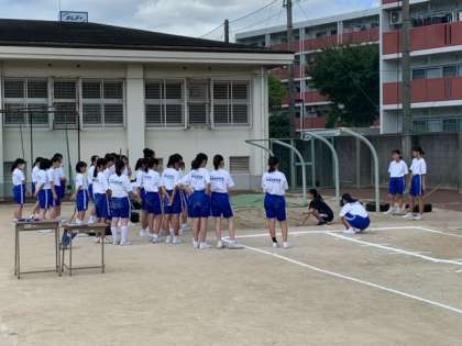 2年生女子体育の授業は走幅跳です。暑さ対策でテントを出しています。昨日から始まっている教育実習の実習生が授業を行っています(写真上、中)