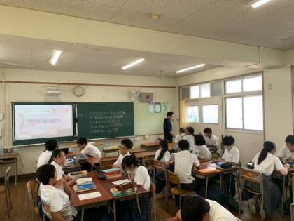 英語の授業は、班ごとに端末を使いゲームをしています。楽しみながら学習しています(写真下)