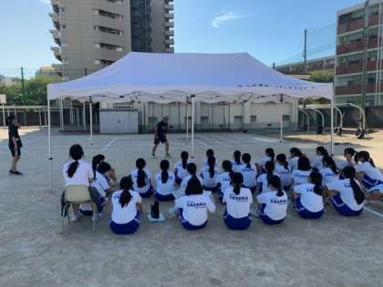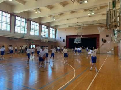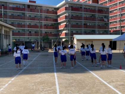 3年生女子の体育の授業は三段跳、午後からは格技室の影を利用し、助走路の向きを変えています。