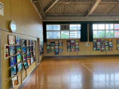 2年生美術科、一点透視図法で描かれた作品と3年生美術科、自画像をモダンテクニック等で描かれた作品です。