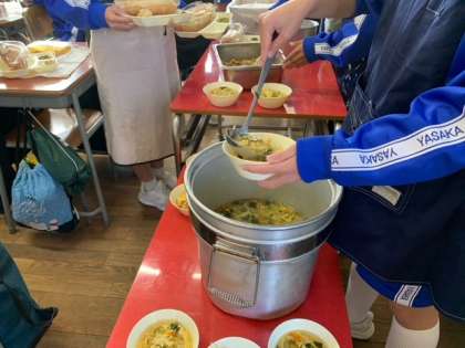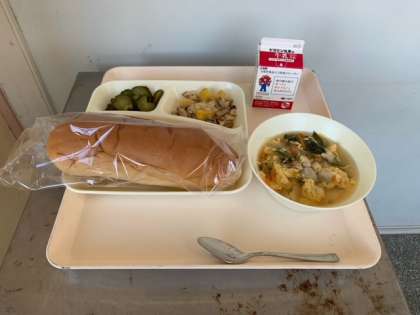 献立は、加工パン、牛乳、中華おこわ、卵スープ、きゅうりのピリ辛あえ です。