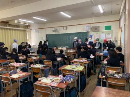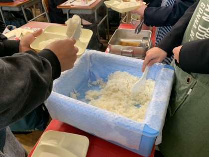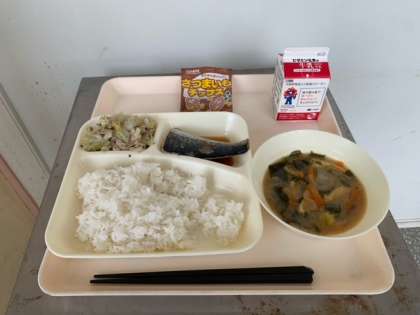 献立は、ごはん、さごしのしょうゆだれかけ、みそ汁、キャベツの赤じそあえ、牛乳、おさつチップスです。美味しくいただきました。
