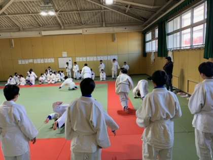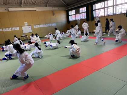 1年生保健体育科の授業は柔道をしています。中には柔道経験者も数名いるようです。寒い中なので、ウォーミングアップでしっかり体を温め安全に注意しながら行っています。