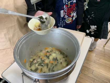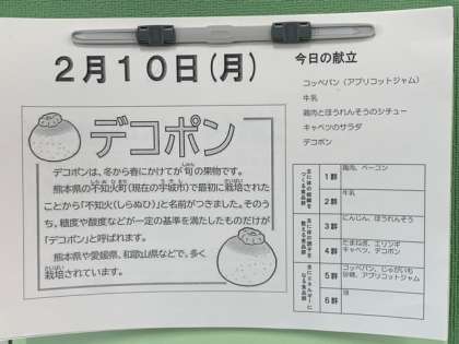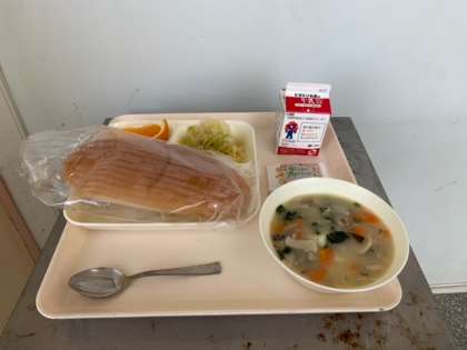 献立は、コッペパン、牛乳、鶏肉とほうれんそうのシチュー、キャベツのサラダ、デコポン、アプリコットジャムです。このデコポン甘くて美味しいです。