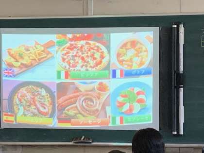 社会科の授業は世界の食文化、美味しそうな料理が並んでいます(写真上・中)