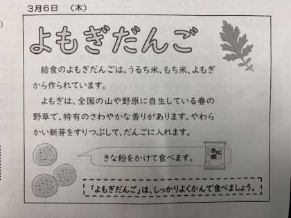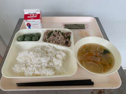 献立は、ごはん、牛乳、豚肉と野菜のいためもの、五目汁、よもぎだんご(きな粉)、焼きのりです。