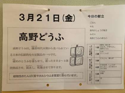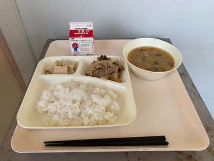 献立は、ごはん、牛乳、豚肉のしょうが焼き、みそ汁、高野どうふの煮もの です。