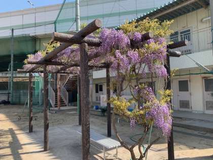 グラウンドの東側に福島区の花、野田藤(のだふじ)が咲いています。一昨日の雨で少し花びらが散ってしまいましたが、きれいに咲いています。