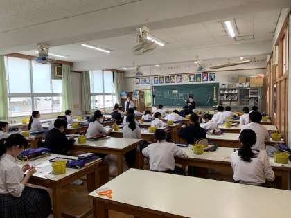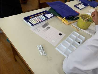 1年生美術の授業です。白色と黒色の色の使い方を学んでいます。結構むずかしいです。
