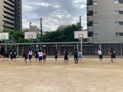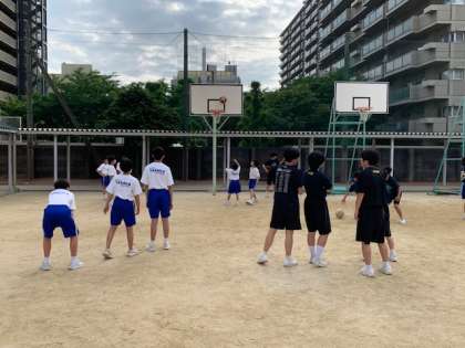 雨は上がりましたが、少し蒸し暑さが残っています。グラウンドでは男女バスケットボール部、陸上部が汗を流しています。
