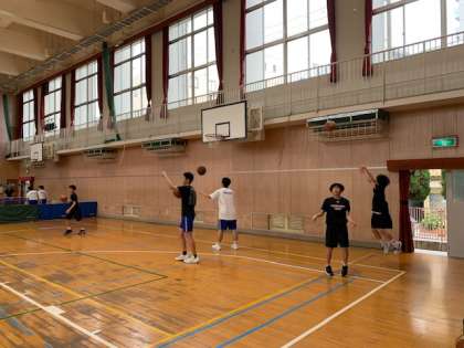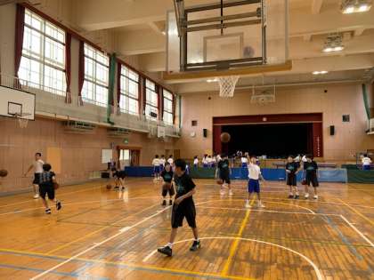 体育館手前側では男子バスケットボール部が練習をしています。怪我のないように集中しています。