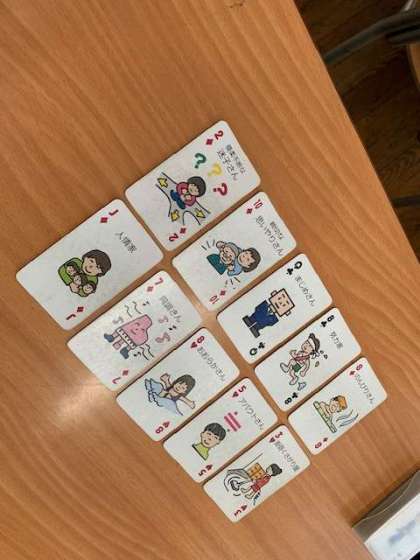 講師の川島様に来ていただいています。子どもたちは10枚のトランプを選び自分の性格と向いてる職業について考えています。