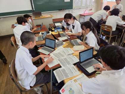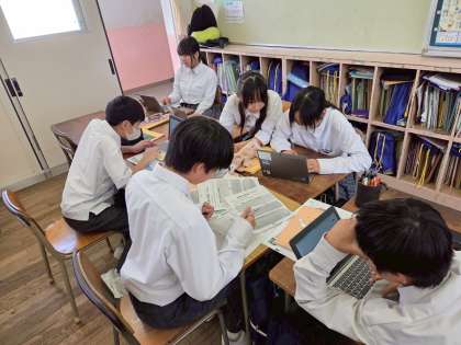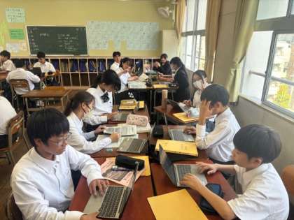 1年生の5、6時間目に万博の取り組みをしました。生徒たちは各班でポスターを制作し、その内容をまとめたスライドを作成して発表準備を進めました。