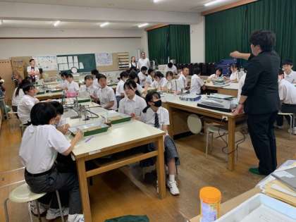 1年生理科、実験中です。保護者の方が見ている中、楽しそうに学んでいます。