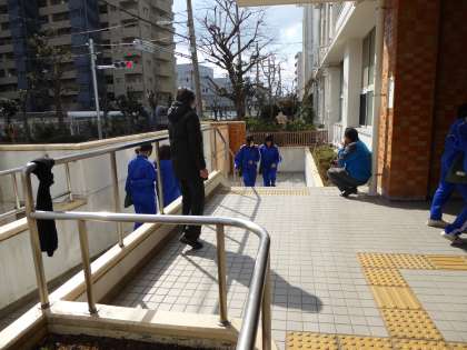 2月24日(水)5・6限に1年生は福祉体験学習として、福島区社会福祉協議会、福祉ボランティアの方々にご指導を受け、車いす体験、アイマスク体験、高齢者疑似体験の3種類を体験しました。