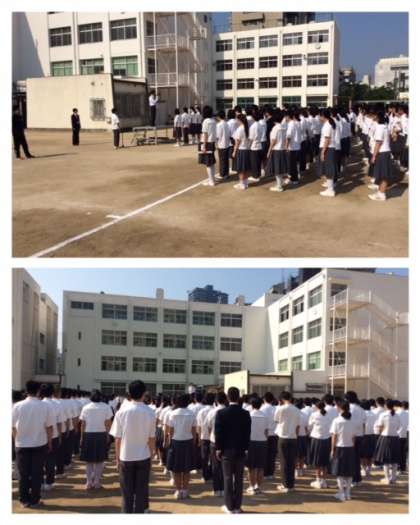 5月23日(月)、本日の全校集会から整列場所を変更しグランドのトラックのラインに合わせて並んでいます。五月晴れの良い天気です。