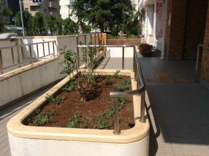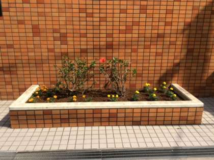 正門に2か所の花壇があります。いつも管理作業員さんに手入れをしていただいています。先日植え替えを行い、夏に向けて