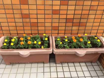 正門の花壇横に、大型プランターが2個出現し、マリーゴールドの苗が植えられています。限られた正門のスペースですが、少しでも花がふえ、明るくなれば生徒たちの心も明るくなると思います。