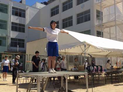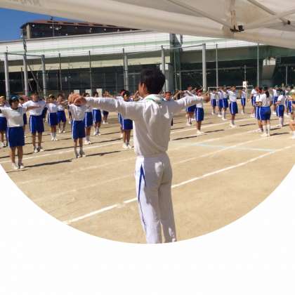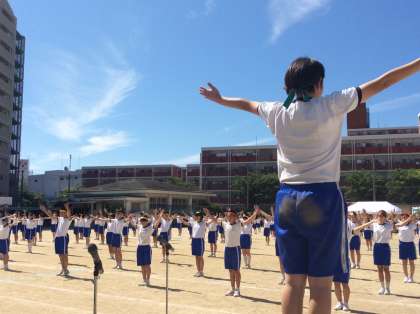 整理体操、女子体育委員の号令で体操体型に開きます。ラジオ体操第一の音楽に合わせて、今日一日の疲れをほぐします。