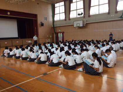 6月8日(水)6限目、体育館において「しおり」を使って説明がありました。生徒たちは真剣に聞き入り、修学旅行に向けての意識が高まりました。