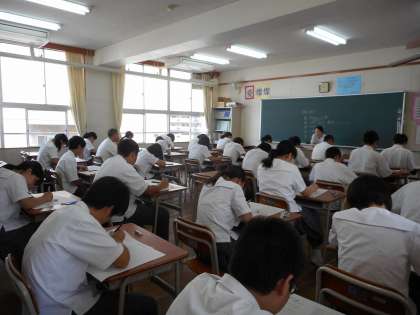 数学・英語・理科・社会・国語の順に実施されます。テストを受けている様子は、どの学級も真剣そのもの、ひたむきな姿が印象的でした。