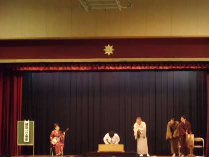 最初に三味線や太鼓を使ってお囃子の紹介や落語の所作の説明をしてもらいました。写真はその時の代表生徒と英語科の坂上先生がステージで落語体験をしている様子です。