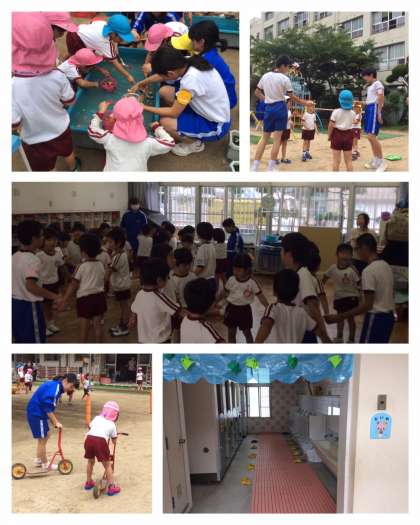 生徒たちはやや緊張気味、園児たちはテンションが上がっているようです。まずはお互いにご挨拶をした後、園児たちの案内で中学生は教室へ入りました。さすがに幼稚園、掲示物もかわいいです。トイレは小さなスリッパが、きっちり整頓してあります。中学生も見習いたい作法です。少しずつ緊張がほぐれていきます。自己紹介をしたり折り紙をしたりしました。